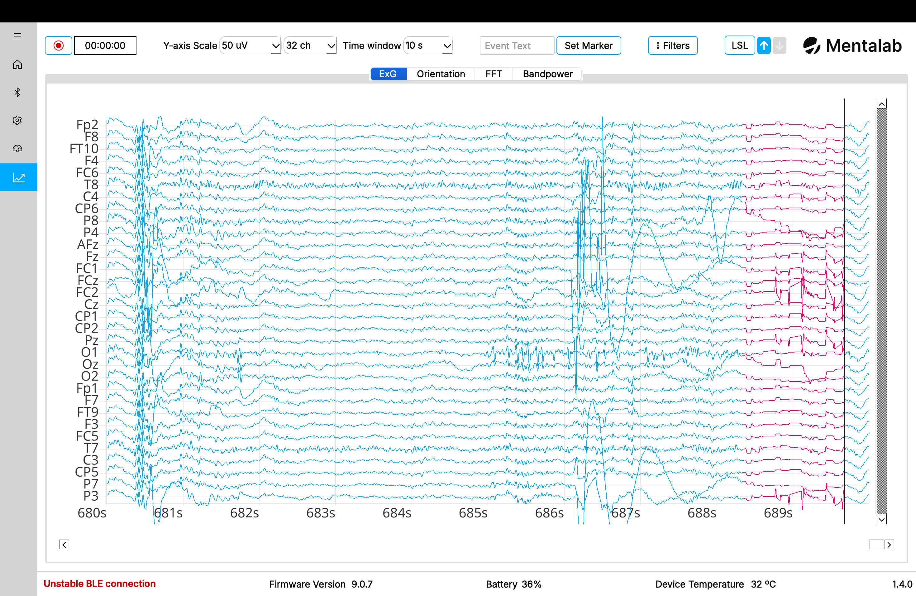 Visualize ExG, orientation, spectral analysis and relative bandpower data in real-time by navigating to the Visualization page.